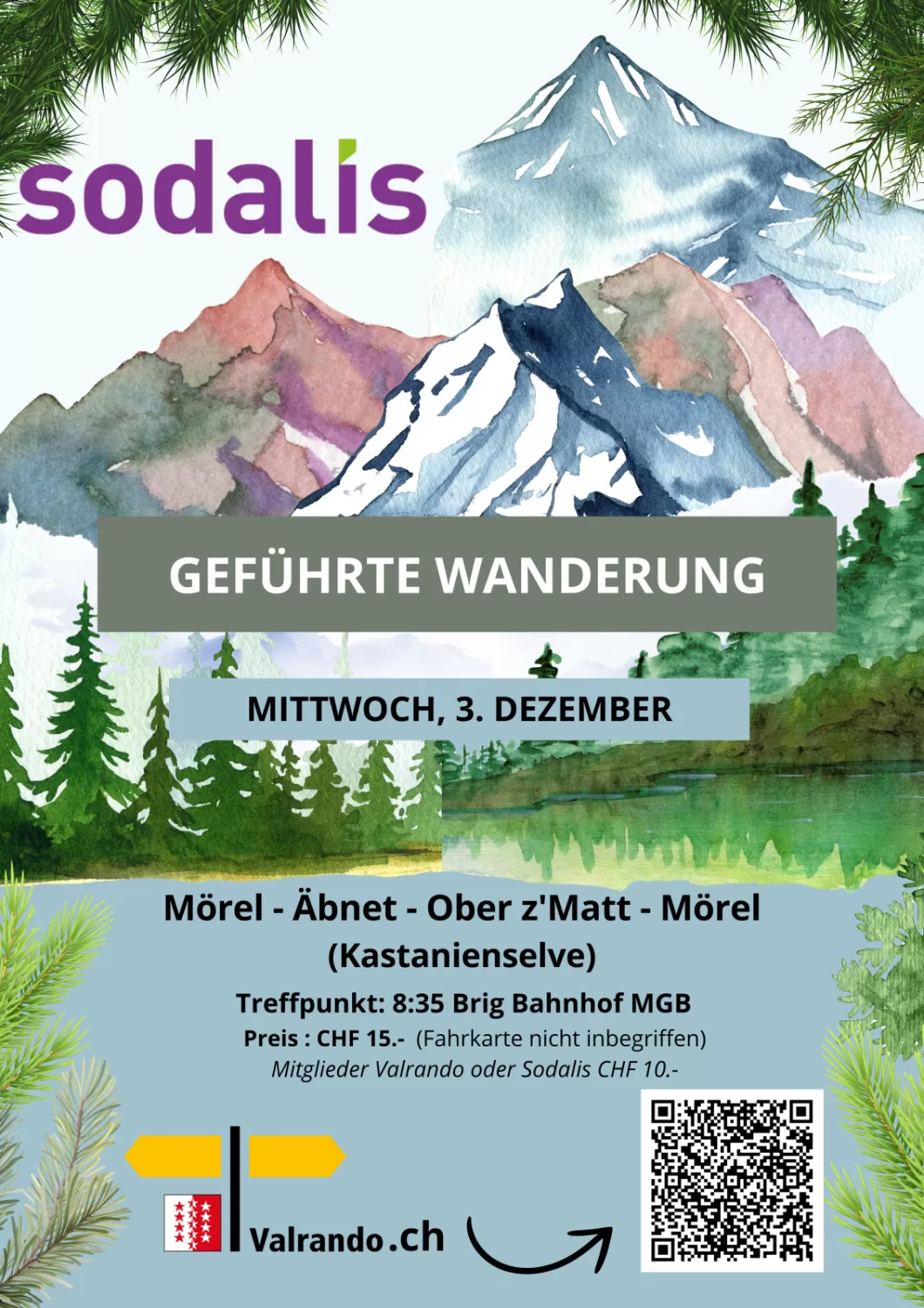 Alle Informationen zu den Wanderungen und Teilnahmebedingungen findet ihr in der Broschüre. sodalis-Versicherte profitieren von einer ermässigten Mitgliedschaft von CHF 39.- statt CHF 50.- bei Valrando im ersten Jahr.